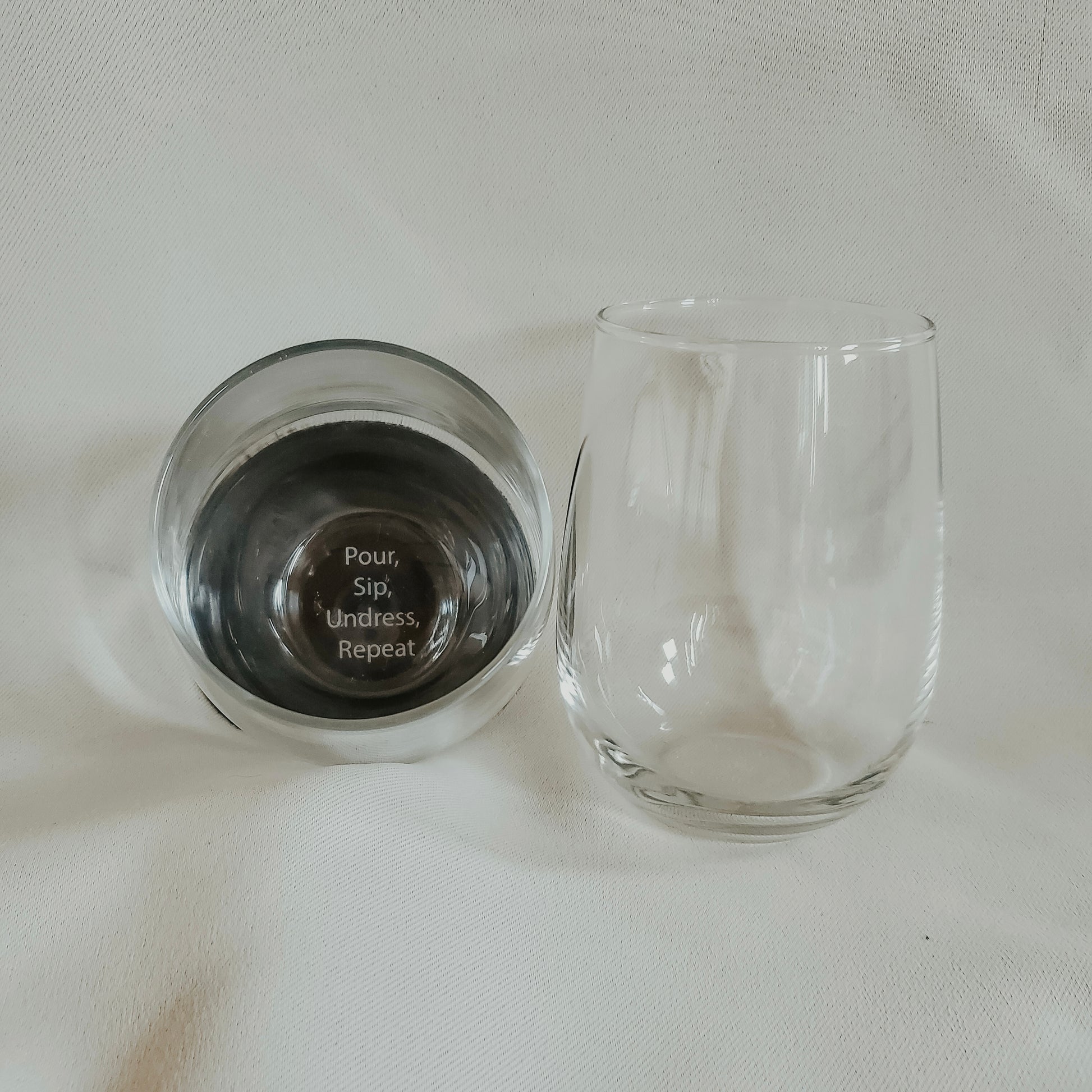 Meet your new favorite partner in wine: our Etched Wine Glass with "Pour, Sip, Undress, Repeat" playfully etched on the bottom. Perfect for those nights when you're indulging in a sultry romance novel—or perhaps something a little more personal—this glass brings a cheeky twist to your wine routine. With each pour, you’ll be reminded to slow down, savor the moment, and let the story (or your company) work its magic. As the wine flows and the plot thickens, that flirty reminder at the bottom is there to keep the night interesting. Whether it’s a solo affair with your favorite book or a seductive evening for two, this glass adds just the right touch of playful romance to every sip. So, pour, sip, undress, repeat—and let the night unfold.